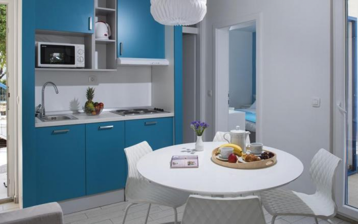 APP 4+2 OLEA (Tip B): prib. 57 m2; 2 spalnici, dnevna soba z raztegljivim kavčem za 2 osebi, kuhinjska niša, kopalnica (prha/WC), dodatni WC.