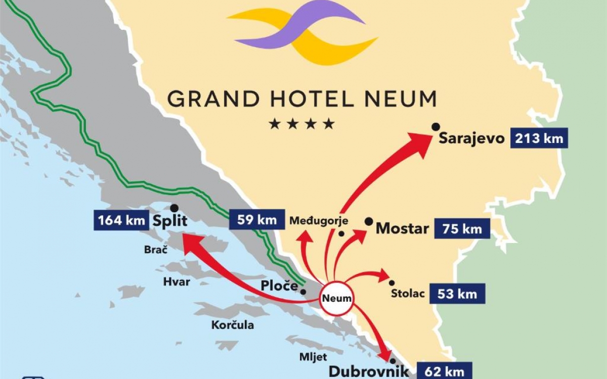 Lega: ob plaži, središče mesta Neum oddaljeno približno 1 km, od romarskega središča Međugorje približno 40 km, ter približno 60 km od Dubrovnika.