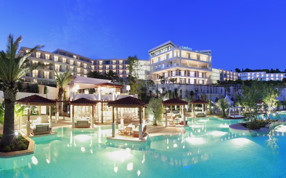 GOSTINSKA PONUDBA: različne restavracije in bari: Windows on Hvar restavracija (samopostrežna, mednarodna in lokalna kulinarika), Cascades & Swim to bar (po naročilu; mednarodna in lokalna kulinarika, jedi iz žara, morska hrana), Splash Beach Bar & Restaurant (po naročilu; ameriška, italijanska in mednarodna kulinarika), Bonj Meditteranean Steak&Seafood Lounge (po naročilu; mediteranska kulinarika, zrezki in morska hrana), Lobba Bar Amfora (po naročilu; ameriška in britanska ter italijanska kulinarika).