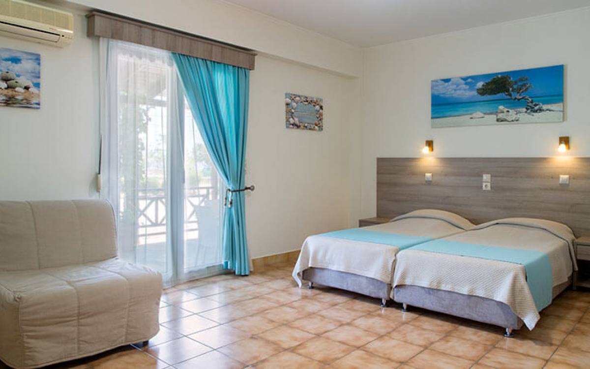 Studii: pribl. 16 m2, prijetno opremljene, klimatska naprava (doplačilo 10 €/dan), brezplačen Wi-Fi, kuhinjska niša, grelnik za vodo, Sat TV, sef (doplačilo 16 €/teden), manjši hladilnik, kopalnica, sušilnik za lase, balkon ali terasa. Nastanitev je primerna za 2 odrasli osebi.