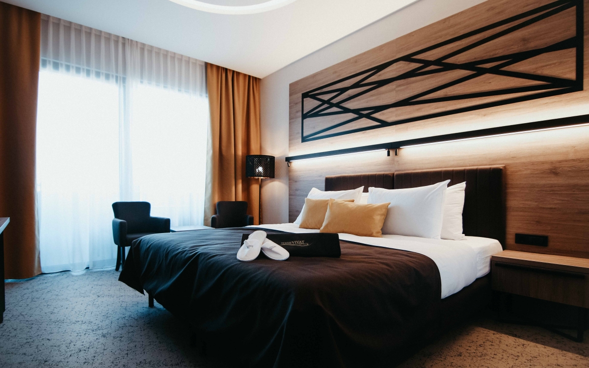Hotel Vivat***** navdušuje z elegantnim sodobnim dizajnom in 166 prostornimi, udobnimi sobami tipov Deluxe, Deluxe suite, Comfort, Comfort Suite in Prestige suite, vse s prostornimi hotelskimi ložami, ki omogočajo popolno udobje in zasebnost. Vsaka soba je opremljena s klimatsko napravo, LCD-televizorjem, telefonom, brezplačnim Wi-Fi-jem, mini barom, sefom ter elegantno kopalnico s prho ali kadjo, straniščem, sušilnikom za lase in ekskluzivnim kozmetičnim kompletom s copatami. Za dodatno udobje je v sobah na voljo tudi kavni in čajni komplet, ki gostom omogoča prijetne trenutke sprostitve ob najljubši topli pijači. Za sproščeno izkušnjo od prihoda dalje hotel nudi tudi storitev valet parkiranja.